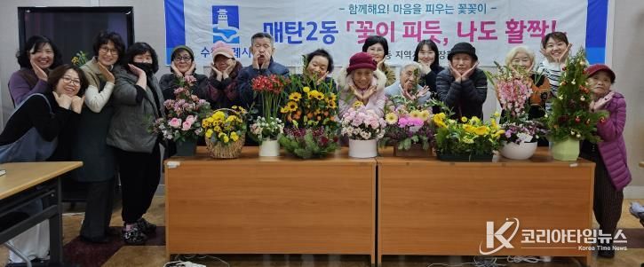 코리아타임뉴스 사회팀 | 지난 1일, 매탄2동 지역사회보장협의체는 특화사업 중 하나인 ‘꽃이 피듯, 나도 활짝!’꽃꽂이 교실을 마무리하며 어르신들의 작품으로 ‘우리들의 작은전시회’를 매탄2동 행정복지센터 민원실에 개최했으며, 4일까지 전시한다.