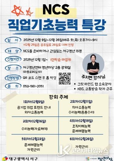 코리아타임뉴스 대구취재본부 | 대구 서구청은 공공기관 등 취업을 준비하는 청년들의 직무 역량 강화를 위하여 서구청년센터 청년마당 12월 프로그램 'NCS(국가 직무능력 표준) 직업 기초 능력 특강' 참여자를 모집한다고 밝혔다.
