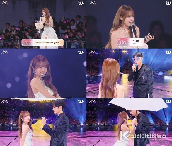 코리아타임뉴스 연예팀 | 가수 최예나(YENA)가 'AAA' 베스트 뮤지션 상을 수상, 추영우와 설렘 퍼포먼스로 존재감을 드러냈다.