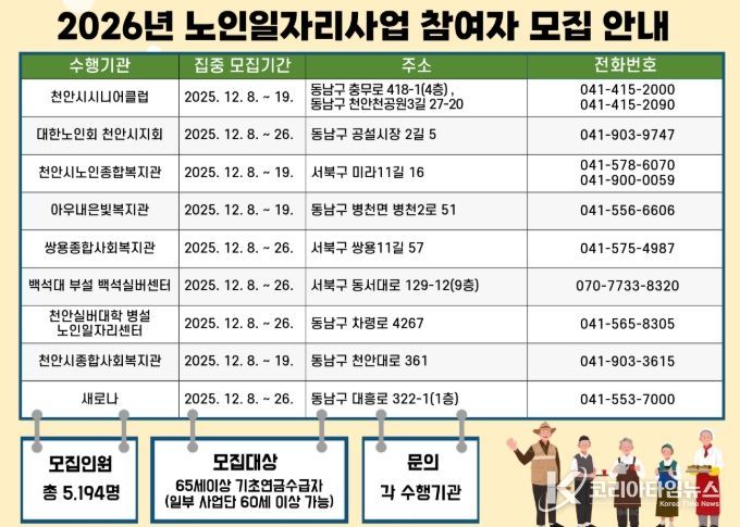 코리아타임뉴스 김택호 기자 | 천안시는 ‘내년도 노인일자리 및 사회활동지원사업’ 참여자를 모집한다고 8일 밝혔다.