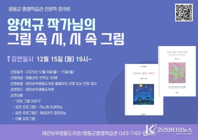 코리아타임뉴스 박찬식 기자 | 충북 영동군은 지역 출신 작가의 시와 그림을 통해 군민들에게 회복과 위로의 메시지를 전하고, 독서 문화 확산을 위한 인문학 북콘서트를 개최한다.