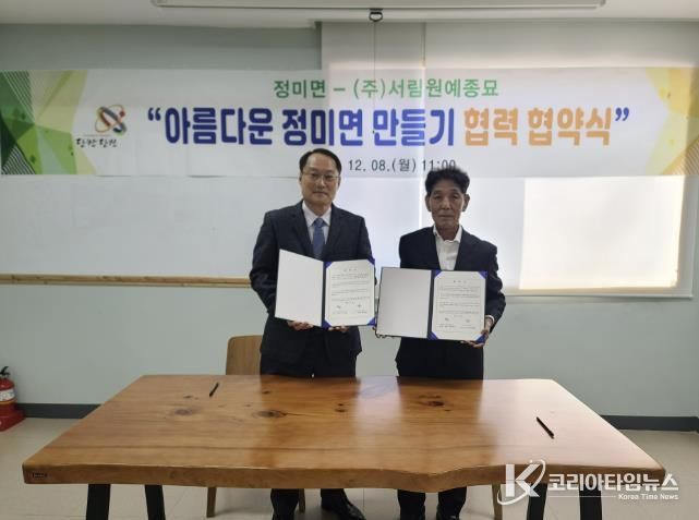 코리아타임뉴스 김택호 기자 | 정미면 행정복지센터는 지난 8일 지역 미관 개선과 쾌적한 생활환경 조성을 위해 ㈜서림원예종묘와 아름다운 정미면 만들기 협력 협약을 체결했다고 9일 밝혔다.