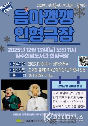코리아타임뉴스 기동취재팀 | 양주희망도서관이 오는 13일 도서관 내 희망극장에서 국악 사물놀이를 기반으로 한 인형극 '음마깽깽 인형극장'을 운영한다.