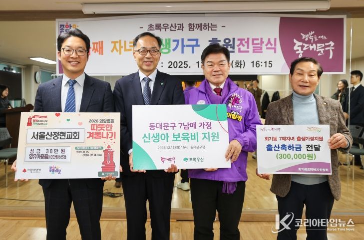 코리아타임뉴스 윤경수 기자 | 서울 동대문구가 관내 ‘일곱째 아이’ 출생 가정을 찾아 축하와 응원의 마음을 전했다. 동대문구는 16일 회기동 주민센터에서 다자녀 가정을 격려하는 행사를 열고, 민간 후원과 연계한 지원 물품과 후원금을 전달했다고 밝혔다.