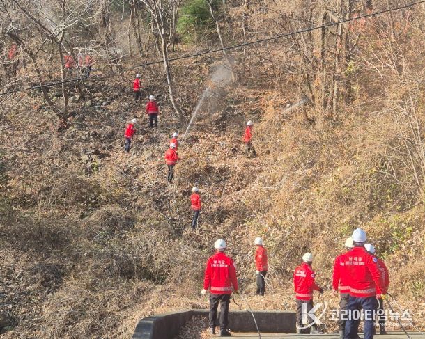 코리아타임뉴스 김태훈 기자 | 남해군은 건조하고 바람이 많이 부는 겨울철을 맞아 대형 산불 발생에 대비하고, 산불진화대의 초기 진화 대응 능력을 강화하기 15일 오전 이동면 용소리 용문사 일원에서 산불대응 모의진화훈련을 실시했다.