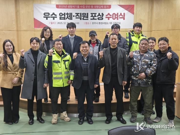 코리아타임뉴스 이아름 기자 | 원주시는 12월 16일 '2025년 생활폐기물 수집ㆍ운반 대행업체 평가결과'에 따른 우수등급 업체 및 소속 직원을 대상으로 원주시장 상장 및 표창장을 수여한다.