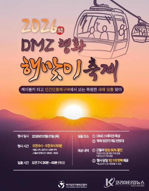 코리아타임뉴스 기동취재팀 | 파주시는 2026년 1월 1일 새해 첫날, 파주임진각평화곤돌라에서 임진강과 디엠제트 일대를 조망하며 새해 소망을 기원하는 녪디엠지 평화 해맞이 축제’를 진행한다고 밝혔다.