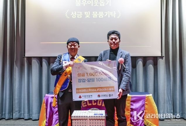코리아타임뉴스 이아름 기자 | 인천시 중구는 지난 12일 ‘인천마린스카이MJF라이온스클럽(회장 장준희)’이 연말연시를 맞아 지역 내 어려운 이웃을 돕기 위해 성금 100만 원과 방한용품(수면 양말, 장갑) 100세트를 기탁했다고 밝혔다.