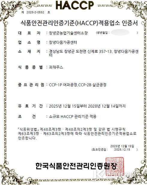 코리아타임뉴스 경남취재본부 | 창녕군은 농업기술센터에서 운영하는 창녕다움가공센터가 한국식품안전관리인증원 식품안전관리인증기준(HACCP) 평가에서 ‘적합’ 판정을 받아 인증을 획득했다고 밝혔다.