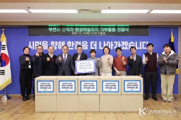 코리아타임뉴스 경기취재본부 | 부천시는 지난 16일 직원들이 보유한 항공마일리지를 활용해 물품을 구매하고 이를 지역 복지시설에 기부하는 연말 나눔 행사를 열었다. 이번 행사는 공적 항공마일리지를 사회공헌 활동에 활용하고, 연말을 맞아 지역사회 나눔 문화 확산에 기여하기 위해 추진됐다.