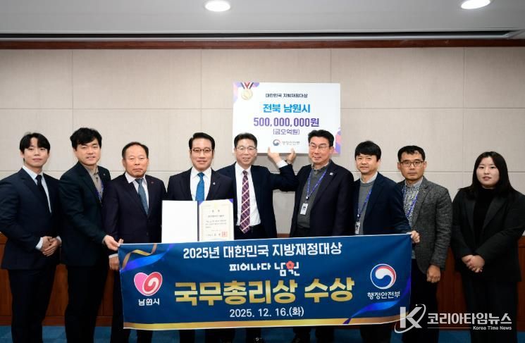 코리아타임뉴스 김태훈 기자 | 남원시가 지난 16일 행정안전부 주관 '제18회 대한민국 지방재정대상'에서 ‘국무총리상’을 수상하고 교부세 인센티브 5억 원을 확보했다고 밝혔다.