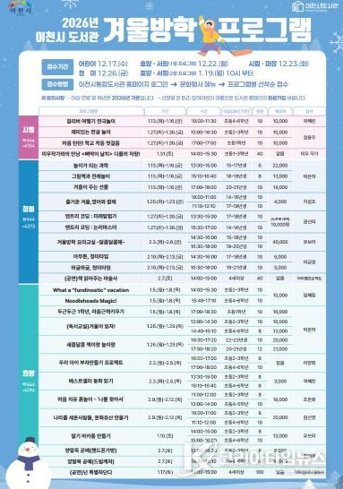 코리아타임뉴스 문화팀 | 이천시는 2026년 1월부터 2월까지 겨울방학 기간에 어린이를 대상으로 한 다양한 독서문화 프로그램을 운영한다고 밝혔다.