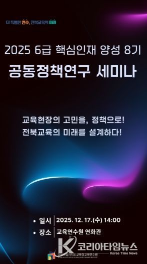 코리아타임뉴스 사회팀 | 전북특별자치도교육청교육연수원은 17일 연수원 연화관에서 ‘2025. 6급 핵심인재 양성 8기 공동정책연구 세미나’를 개최했다.