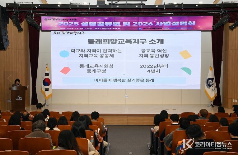 코리아타임뉴스 부산취재본부 | 부산 동래구는 지난 15일 동래구청 동래홀에서 동래교육지원청과 함께 ‘2025년 성장공유회 및 2026년 사업설명회’를 성황리에 개최했다고 밝혔다.