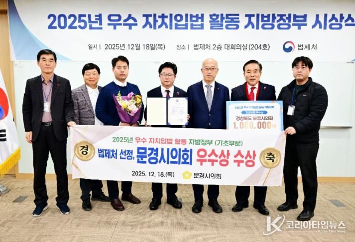 코리아타임뉴스 노승선 기자 | 문경시의회는 12월 18일 정부세종청사 법제처에서 열린 ‘2025년도 우수 자치입법 활동 지방정부’시상식에서 우수기관으로 선정돼 법제처장 기관표창을 수상했다.