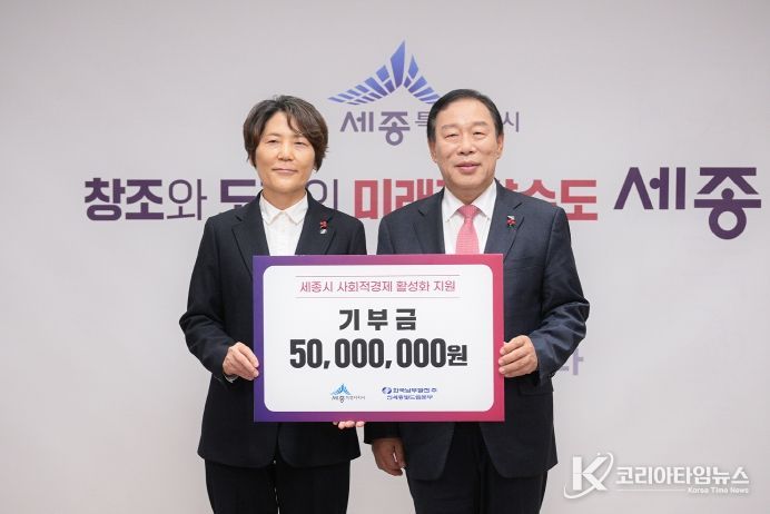 코리아타임뉴스 세종취재분부 | 세종특별자치시(시장 최민호)가 18일 한국남부발전㈜ 신세종빛드림본부로부터 사회적경제 활성화를 위한 기부금 5,000만 원을 전달받았다.