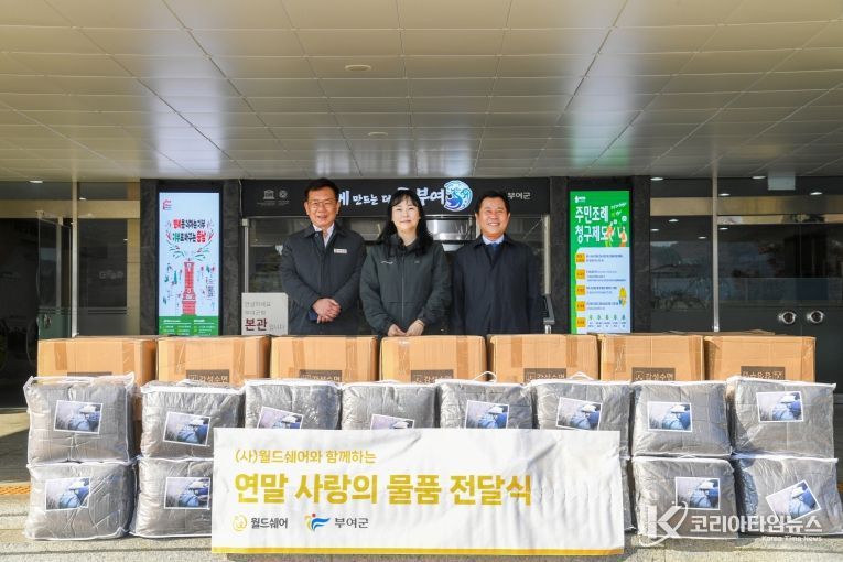 코리아타임뉴스 충남취재본부 | 부여군은 지난 18일, (사)월드쉐어(대표 최순자)가 관내 드림스타트 가족 80가구에 겨울용 이불 80개를 전달 했다고 밝혔다.