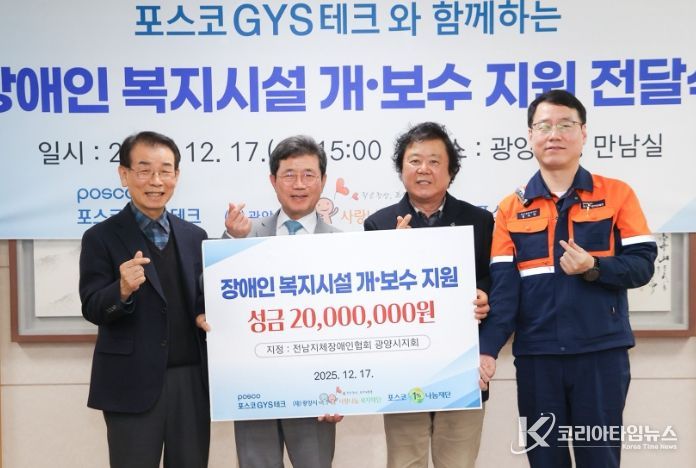코리아타임뉴스 전남취재본부 | 광양시는 지난 17일 포스코GYS테크가 사회복지시설 개·보수를 위한 지정기탁금 2천만 원을 전남지체장애인협회 광양시지회에 전달했다고 밝혔다.
