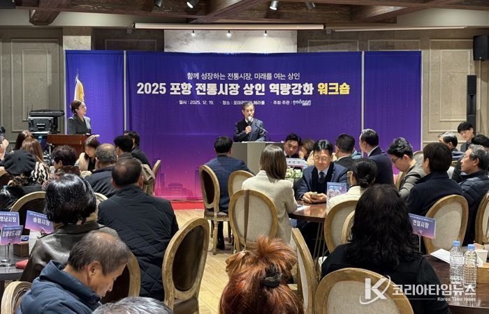 코리아타임뉴스 경북취재본부 | 포항시는 지난 19일 포마레웨딩컨벤션에서 서재원 포항시 정무특보, 임주희 포항시의회 경제산업위원장을 비롯해 지역 전통시장 상인회 임원 등 관계자 100여 명이 참석한 가운데 2025년 ‘포항시 전통시장 상인 역량강화 워크숍’을 개최했다.