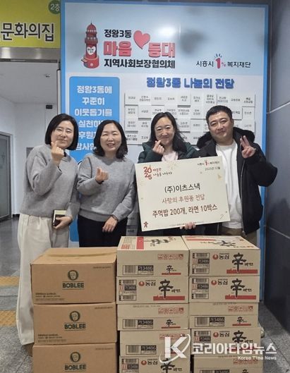 코리아타임뉴스 경기취재본부 | ㈜이츠스낵은 지난 12월 19일 정왕3동 지역사회보장협의체를 찾아 저소득 결식 우려 가구를 위한 주먹밥 200개와 라면 10상자를 전달했다.