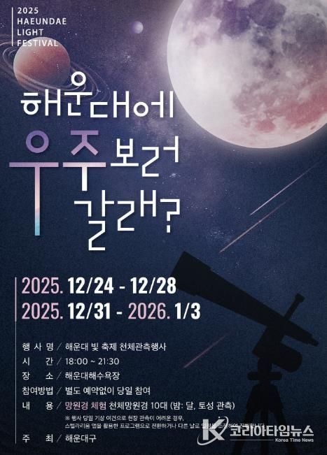 코리아타임뉴스 김태훈 기자 | 해운대구가 해운대빛축제 특별 이벤트 ‘우주 보러 갈래’를 12월 24~28일, 12월 31일~1월 3일에 운영한다.