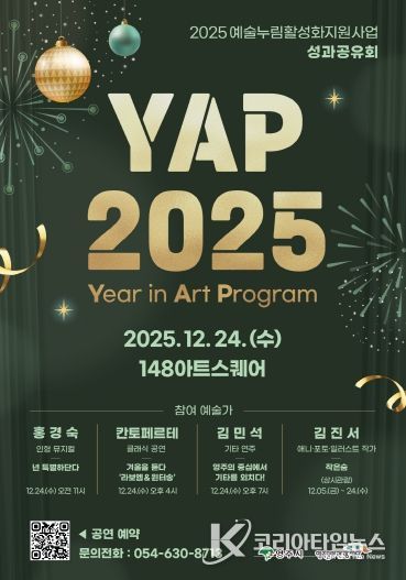 코리아타임뉴스 노승선 기자 | (재)영주문화관광재단은 오는 12월 24일 148아트스퀘어에서 크리스마스 컨셉의 ‘2025 예술누림활성화 지원사업 성과공유회 'YAP 2025'’를 개최할 예정이다.