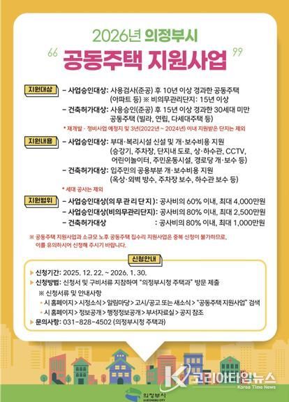 코리아타임뉴스 기동취재팀 | 의정부시는 노후 공동주택의 관리비용 부담 완화와 주거환경 개선을 위해 내년 1월 30일까지 ‘2026년 공동주택 지원사업’ 신청을 받는다.