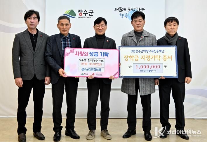 코리아타임뉴스 김태훈 기자 | 장수군 이장협의회가 지역인재 양성과 이웃사랑 실천을 위해 장수군 애향교육진흥재단과 전북사회복지공동모금회에 장학금과 이웃돕기 성금 100만원을 각각 기탁했다고 22일 밝혔다.