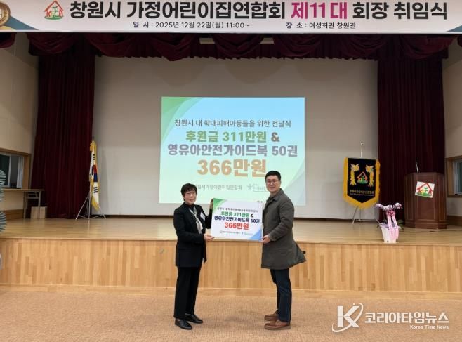 코리아타임뉴스 오영주 기자 | 창원특례시는 창원시가정어린이집연합회에서 22일 개최된 제10·11대 회장 이취임식을 맞이하여 관내 학대피해아동을 지원하기 위한 후원금과 도서를 창원시아동보호전문기관에 전달했다고 밝혔다.