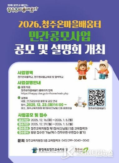 이번 공모사업은 '청주온마을학교', '청주형 마을교육회 및 협력학교'를 중심으로, 지역의 인적‧물적 자원을 활용한 다양한 교육활동을 발굴·지원하기 위해 추진된다. '청주온마을학교'란 학생의 필요에 맞는 특별프로그램을 기획해 방과후, 주말, 방학을 이용해 무료로 지원하는 프로그램으로서 2026년에는 20개 내외의 단체를 선정할 예정이다.