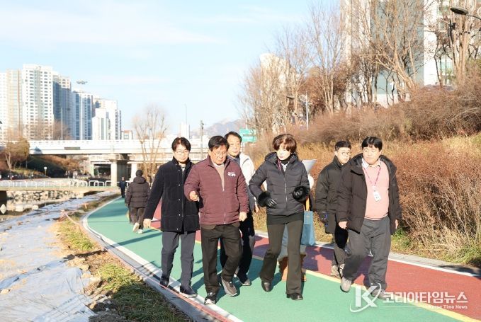 코리아타임뉴스 노승선 기자 | 박강수 마포구청장은 12월 22일 오후 3시, 성산천 일대에서 구 부서장들과 함께 지난 2일 정비를 마친 성산천을 둘러보며 변화된 모습을 살폈다.