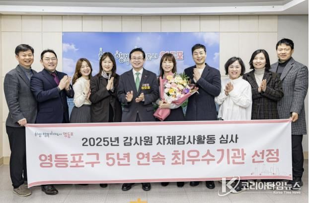 코리아타임뉴스 윤광희 기자 | 영등포구가 감사원 주관 ‘2025년 자체 감사활동 심사’에서 최고 등급인 A등급을 받아 ‘5년 연속’ 최우수기관으로 선정되며 감사원 기관 표창을 수상했다고 밝혔다. 이는 전국 지방자치단체 가운데 유일한 사례로, 구의 체계적이고 선도적인 자체 감사 운영 역량을 다시 한번 입증했다.