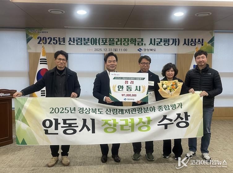 코리아타임뉴스 노승선 기자 | 안동시는 경상북도 주관 12월 22일 ‘2025년 산림레저관광분야 종합평가’에서 장려상을 수상했다고 밝혔다.