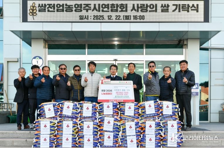 코리아타임뉴스 노승선 기자 | (사)한국쌀전업농 영주시연합회(회장 송희찬)는 지난 22일 영주시청 전정에서 지역 취약계층을 위한 사랑의 쌀 1,500kg(10kg 150포, 500만 원 상당)을 기탁하며 연말 나눔의 온기를 더했다.