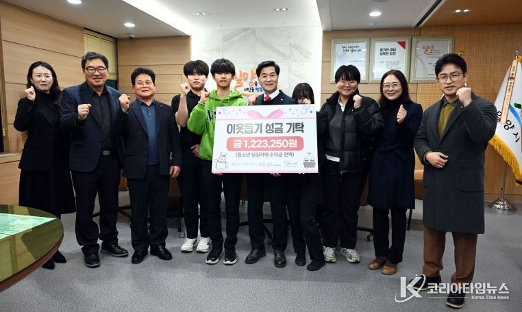 코리아타임뉴스 경남취재본부 | 밀양시는 지난 22일 청소년문화의집 소속 청소년들이 시장실을 방문해 직접 운영한 일일카페 수익금 122만 3,250원을 연말 이웃돕기 성금으로 기부했다고 밝혔다.