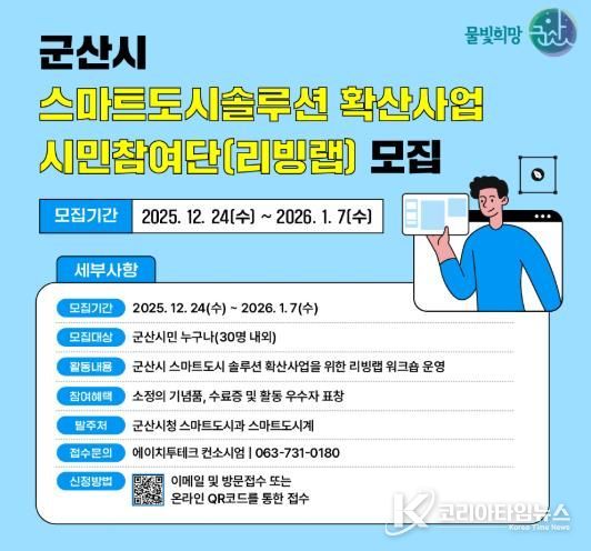 코리아타임뉴스 김태훈 기자 | 군산시가 국토교통부 주관 ‘스마트도시 솔루션 확산사업’ 추진의 하나로 시민이 직접 참여해 문제를 진단하고 개선방안을 도출하는 ‘스마트도시 솔루션 확산사업 리빙랩 시민참여단’을 2026년 1월 7일까지 모집한다.
