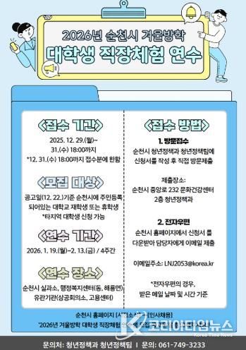 코리아타임뉴스 전남취재본부 | 순천시는 겨울방학을 맞아 대학생들에게 행정 현장 경험의 기회를 제공하기 위해 ‘2026년 겨울방학 대학생 직장체험 연수생’을 모집한다고 밝혔다.