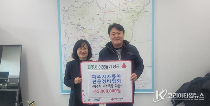 코리아타임뉴스 윤광희 기자 | 파주시는 지난 22일, 파주시자동차전문정비협회가 파주시청을 방문하여 관내 취약계층을 위해 써달라며 현금 5백만 원을 기탁했다고 밝혔다.