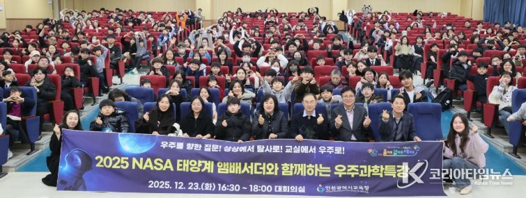 코리아타임뉴스 사회팀 | 인천광역시교육청은 관내 초·중·고등학생 450명을 대상으로 NASA JPL 태양계 앰배서더인 폴윤 교수의 우주과학 특강 ‘NASA 우주 탐사와 우주 경제’를 운영했다.