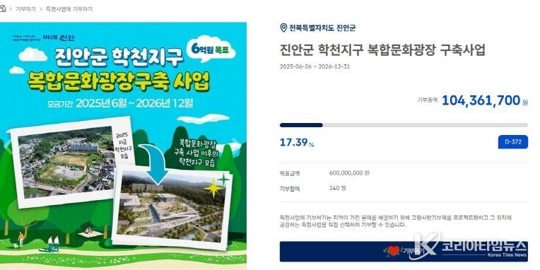 코리아타임뉴스 전북취재본부 | 진안군이 고향사랑기부제 지정기부사업으로 지난 6월부터 추진 중인 “학천지구 복합문화광장 구축사업”이 모금 시작 6개월 만에 누적 모금액 1억 원을 달성했다.