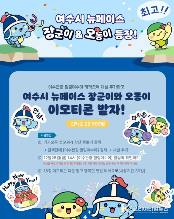 코리아타임뉴스 전남취재본부 | 여수시가 새롭게 리뉴얼된 마스코트 ‘장군이·오동이’ 카카오톡 이모티콘을 오는 26일 오후 2시부터 선착순 2만 5천 명에게 무료로 배포한다고 밝혔다.