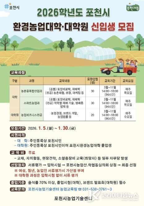 코리아타임뉴스 윤광희 기자 | 포천시는 2026년 1월 5일부터 30일까지 ‘2026학년도 포천시 환경농업대학 및 대학원’ 신입생을 모집한다.