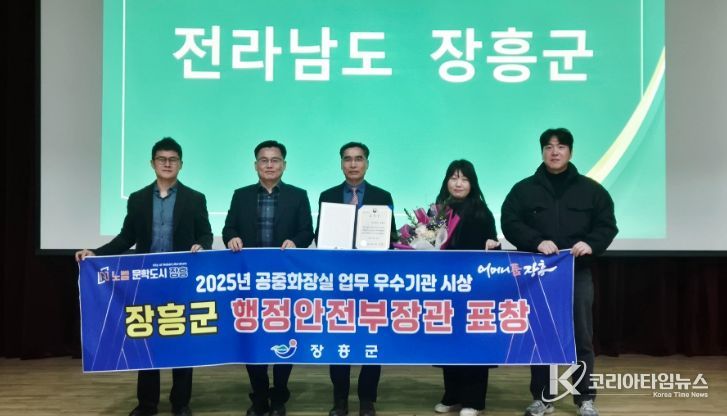 코리아타임뉴스 전남취재본부 | 장흥군이 공중화장실 관리·운영 업무에 대한 공로를 인정받아 23일 행정안전부로부터 공중화장실 업무 유공 기관표창을 수상했다.