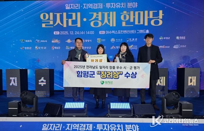 함평군은 지난 24일 여수 엑스포컨벤션센터 그랜드홀에서 열린 ‘전라남도 일자리·경제 한마당 행사’에서 2025년 일자리 창출 우수 시군 평가 결과 ‘장려상’을 수상했다고 25일 밝혔다. 이는, 2018년 수상 이후 7년 만의 쾌거이다.