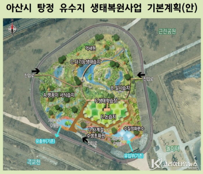 사업 대상지는 탕정지구 도시개발로 조성된 유수지다. 약 1만 4,492㎡의 전체 면적 중 8,700㎡가 생태복원 구역으로 편입된다.