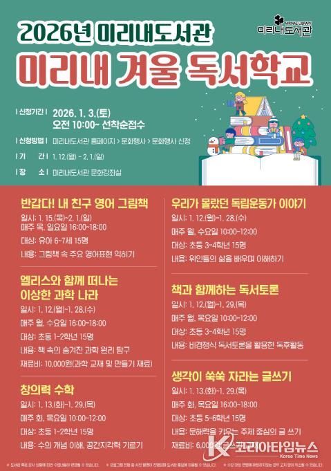 코리아타임뉴스 이아름 기자 | 원주시 미리내도서관은 오는 1월 유아와 어린이를 대상으로 ‘미리내 겨울 독서학교’를 운영한다.