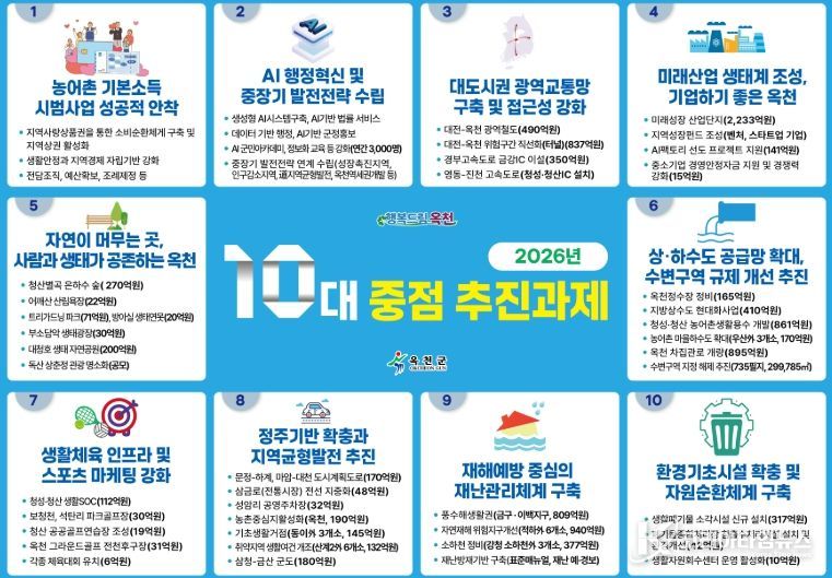 코리아타임뉴스 충북취재본부 | 옥천군이 26일 2026년 군정 운영의 핵심 방향을 담은 10대 중점 추진과제를 발표하고, 군민 삶의 질 향상과 지속가능한 지역성장을 위한 정책 추진에 나선다.