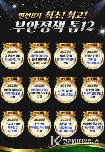 코리아타임뉴스 전북취재본부 | 부안군은 민선 8기 출범 이후 추진해 온 주요 정책 성과를 종합적으로 되짚고 앞으로의 군정 방향과 실천 의지를 군민과 공유하기 위해 민선 8기 최초·최고 부안정책 톱12를 선정·발표했다고 밝혔다.