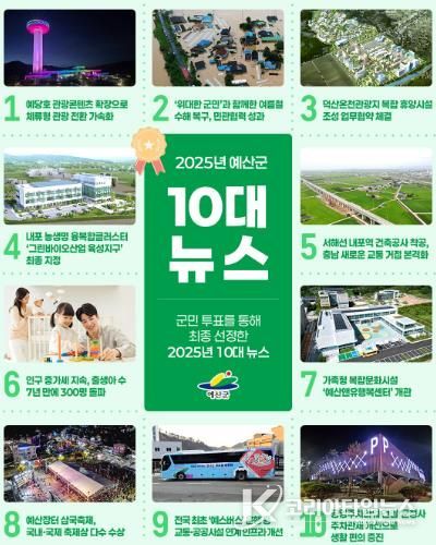 코리아타임뉴스 김택호 기자 | 예산군은 2025년 한 해 동안 군정 전반에서 의미 있는 성과를 거둔 주요 정책과 사업을 담은 ‘2025년 올해의 군정 10대 뉴스’를 지난 10일부터 24일까지 진행한 군민 투표를 통해 최종 선정했다고 밝혔다.