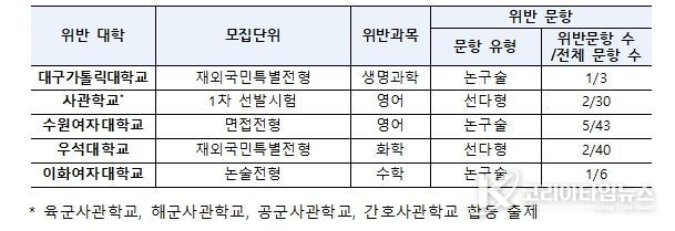 대구가톨릭대학교는 생명과학 1문항, 사관학교는 영어 2문항, 수원여자대학교는 영어 5문항, 우석대학교는 화학 2문항, 이화여자대학교는 수학 1문항이 고등학교 교육과정 범위를 위반한 것으로 나타났다. 위반 문항 비율은 대학별고사를 시행한 전체 대학의 문항 중 0.3%였다.